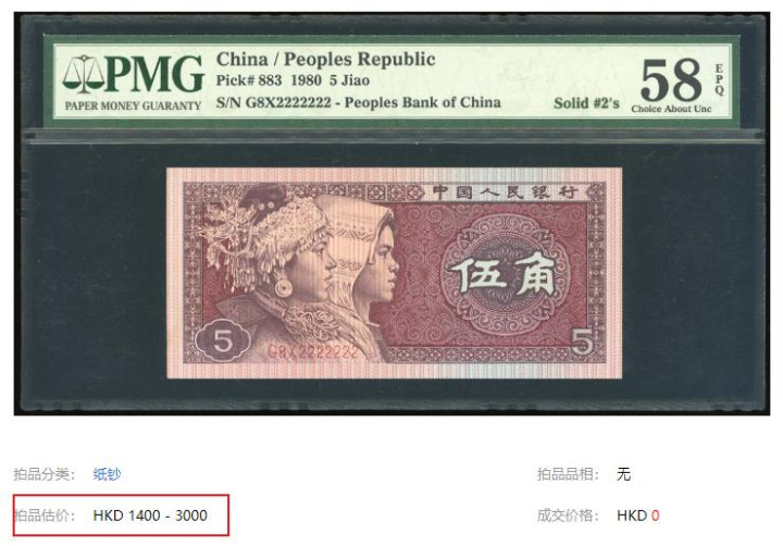 1980年版5角纸币(简称8005)发行量庞大,普通品在市场上几乎只值面额,很多人甚至直接忽略。但你可能不知道,一旦它拥有满分评级或者稀有号码,身价立刻翻倍。比如一张PMG70分的8005,在拍卖会上成交价高达2400元,而麒麟号的估价更是2800元。